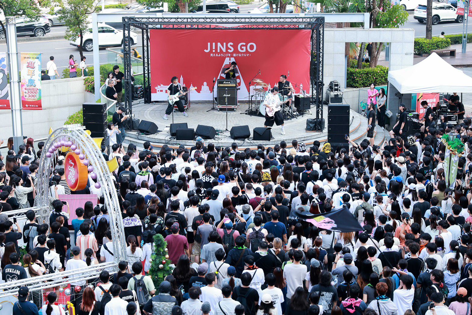 三位團員各自以眼鏡搭配舞台造型,展現不同個性。貝斯手大寶大讚「JINS 眼鏡超好看」,主唱閃亮更現場即興創作,用音樂唱出對JINS的喜愛。活動中,主持人豆比登帶領廣場上千名粉絲大玩「眼明手快」遊戲,有民眾展現驚人手速,一口氣抱走八支 JINS 墨鏡,引發現場驚呼連連。