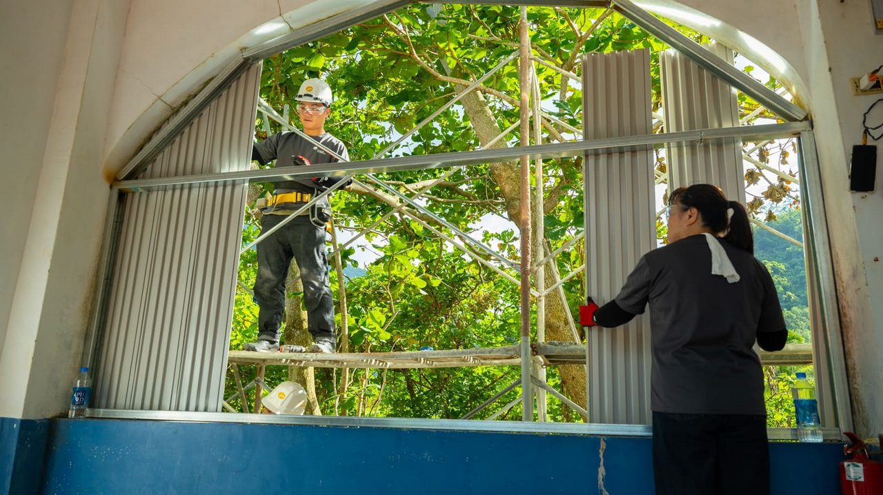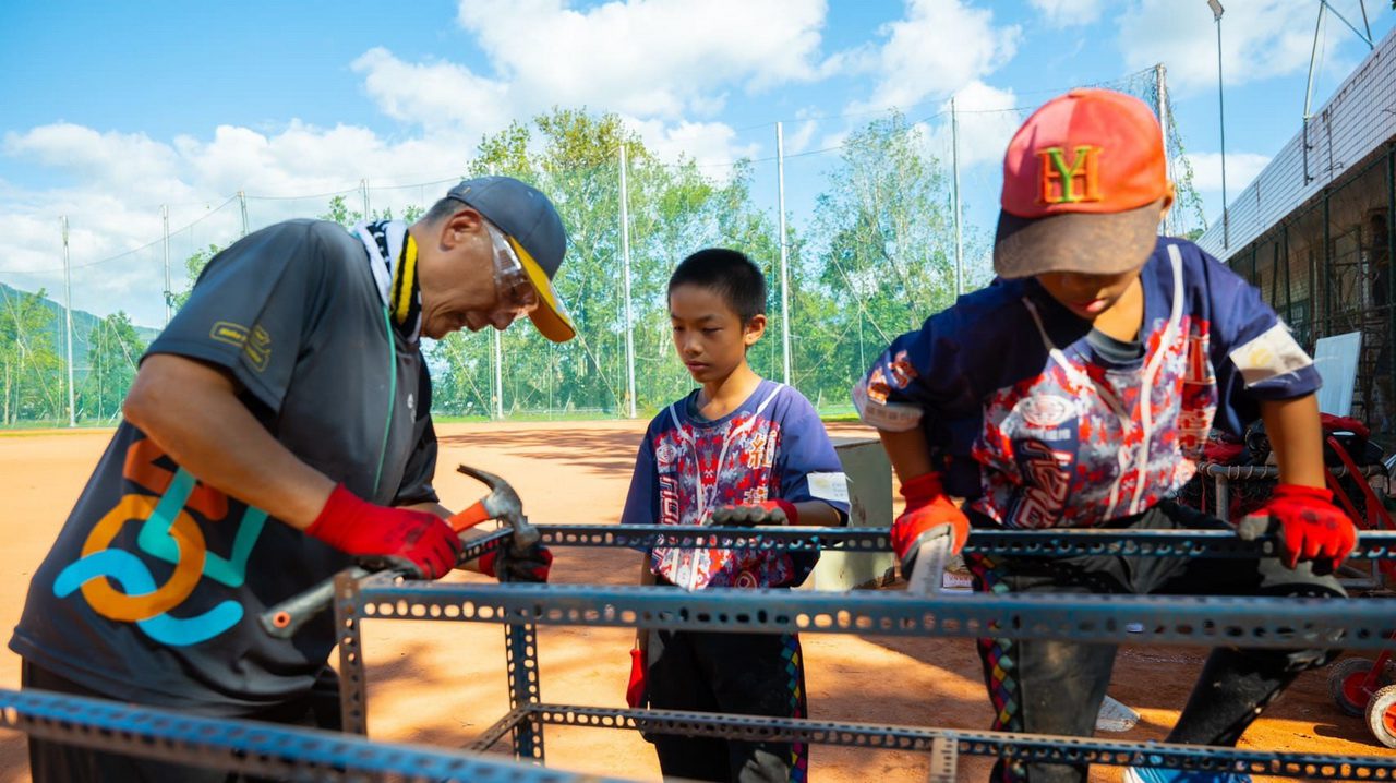 此次志工分為兩組行動團隊,分別負責球場廁所改建與球員休息室優化。在球場廁所部分,為了讓小球員能專注訓練、不必再花時間往返教學樓,志工們汰換全新廁所門與馬桶出水馬達,讓硬體設施恢復正常使用。另一組志工則發揮巧思與專業,將鄰近的第二看台區改造成設備器材室,透過加裝鋁拉門與鋁隔窗,延伸室內使用空間並加強防風避雨機能。同時也親手打造金屬鋼層架與球具架,建立系統化收納空間,讓球具能整齊歸位,營造更舒適有序的休息環境。為了讓學童們更珍惜所擁有的資源,基金會邀請少棒隊小球員一起加入行列,整理物品、協助扶著鋼材及組裝金屬層架。看著參與打造的全新休息室與專屬球具架逐漸成型,孩子們的臉上洋溢著成就感與期待。