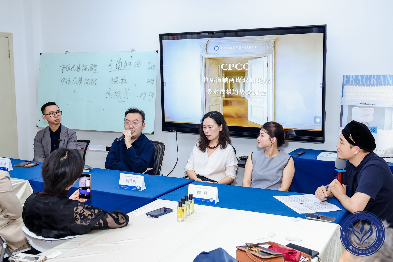 本次最具代表性的重頭戲,是於上海香料研究所舉辦的首屆「海峽兩岸香氛趨勢論壇」。論壇以「香氛品牌如何市場化」為主題,由郭明政老師主持,集結多位產業領袖與品牌創辦人同台對談,包括穎通集團代表顧瑋玥、中國美容博覽會(CBE)代表郭世奇、《拓趣》品牌主理人四月、EKA天物創變者群落合夥人王子燁,以及國際香氛藝術協會(ISSA)理事長何宗禧。