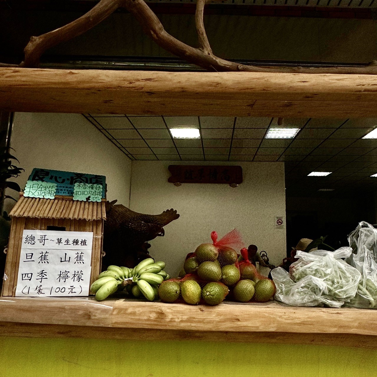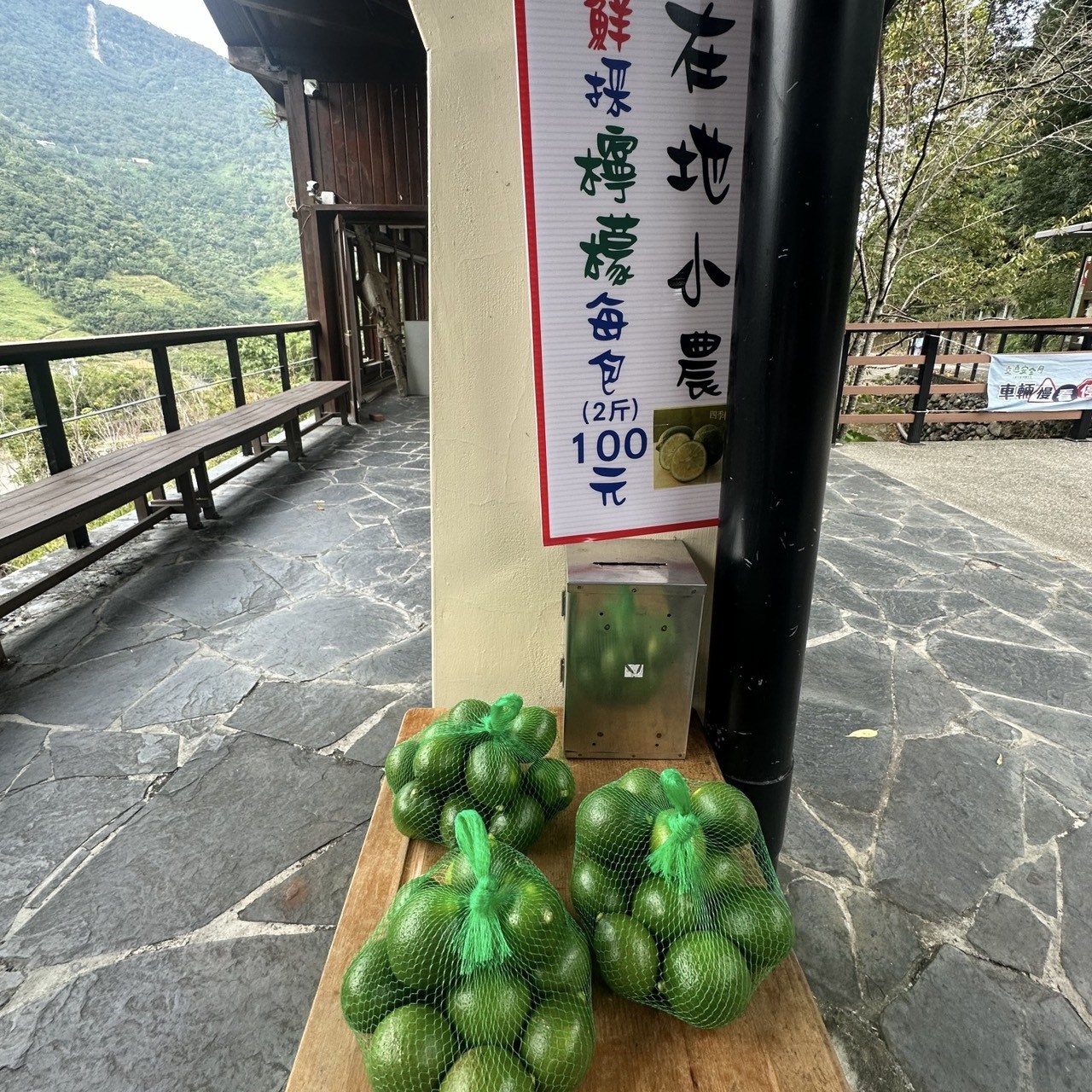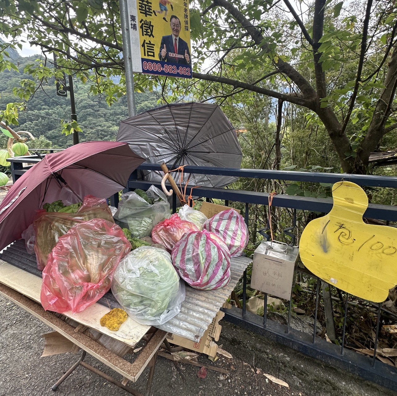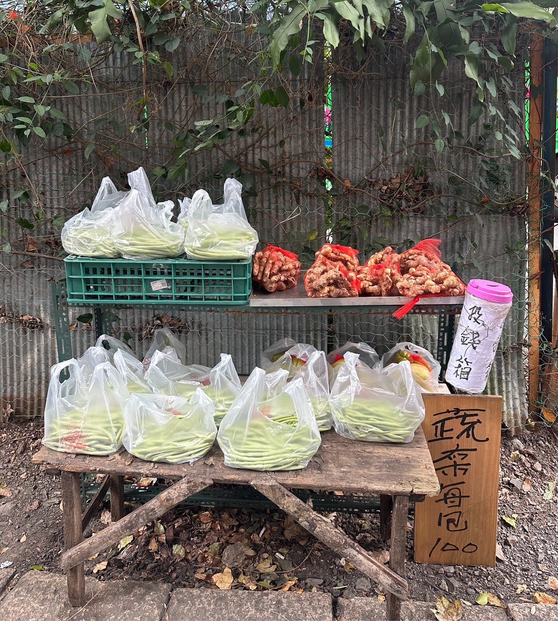 一袋袋翠綠的青菜整齊擺放,簡單的紙牌上寫著「一包100元,請投箱謝謝!」;有的農家門口放著自家種的山蕉與四季檸檬;也有居民將乾燥花、手作品或農產放在木桌上,旁邊擺著一個小小的投幣箱。這些不起眼的小攤位,串起了整個村落的誠信文化,也讓來訪的旅人深受感動。