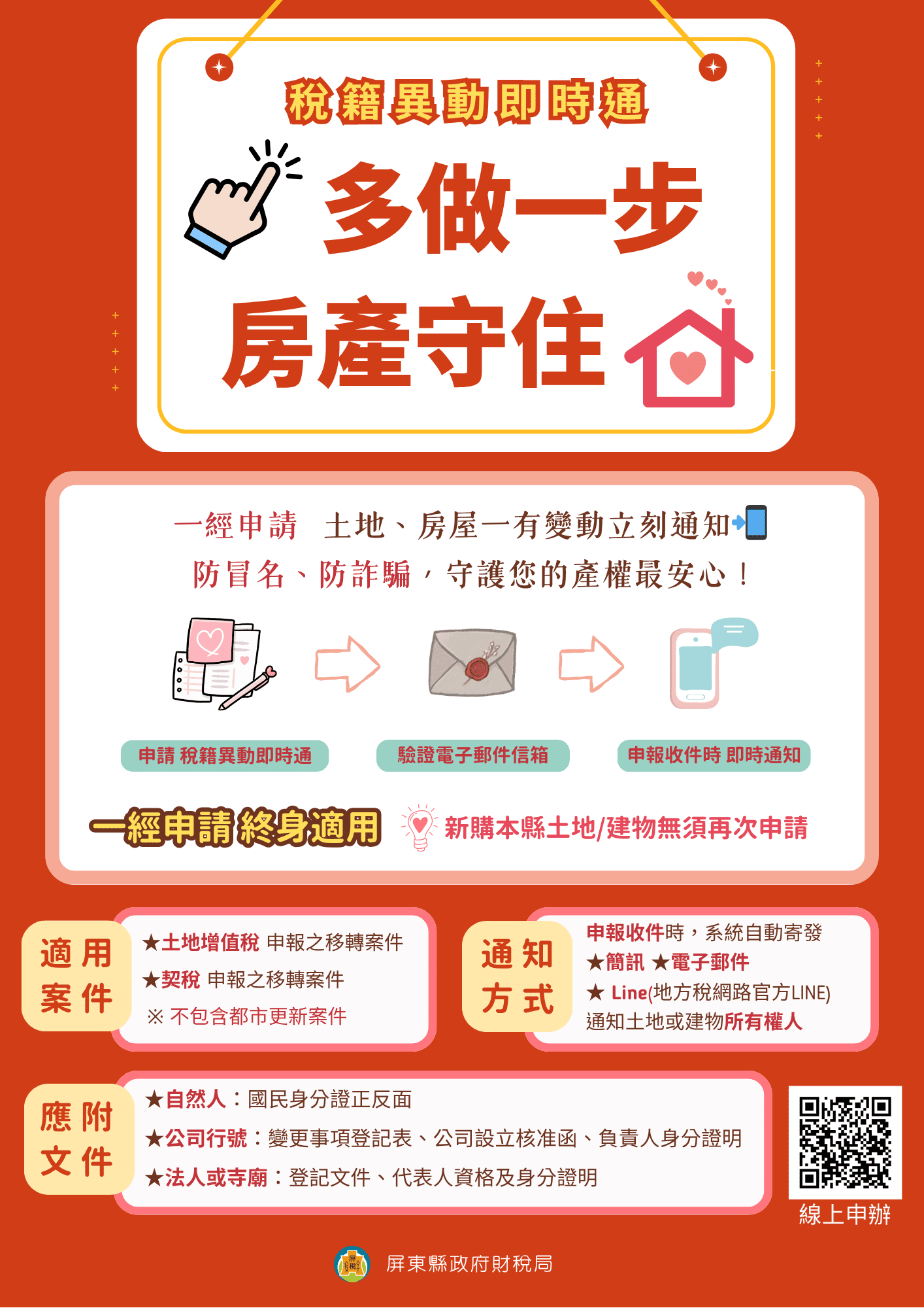 屏東縣政府財稅局提醒民眾,近年詐騙與冒名過戶案件層出不窮,申辦「稅籍異動即時通」不僅能掌握名下不動產異動狀況,更能在第一時間發現可疑情形、即刻處理。歡迎鄉親踴躍申請,讓科技守護您的資產安全。