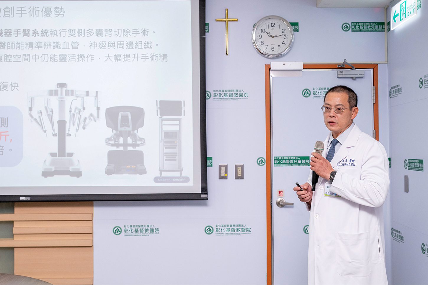 ▲泌尿外科陳俊吉醫師指出,患者多囊腎體積龐大壓迫腹腔,團隊以達文西手術精準切除。(圖/彰基提供)