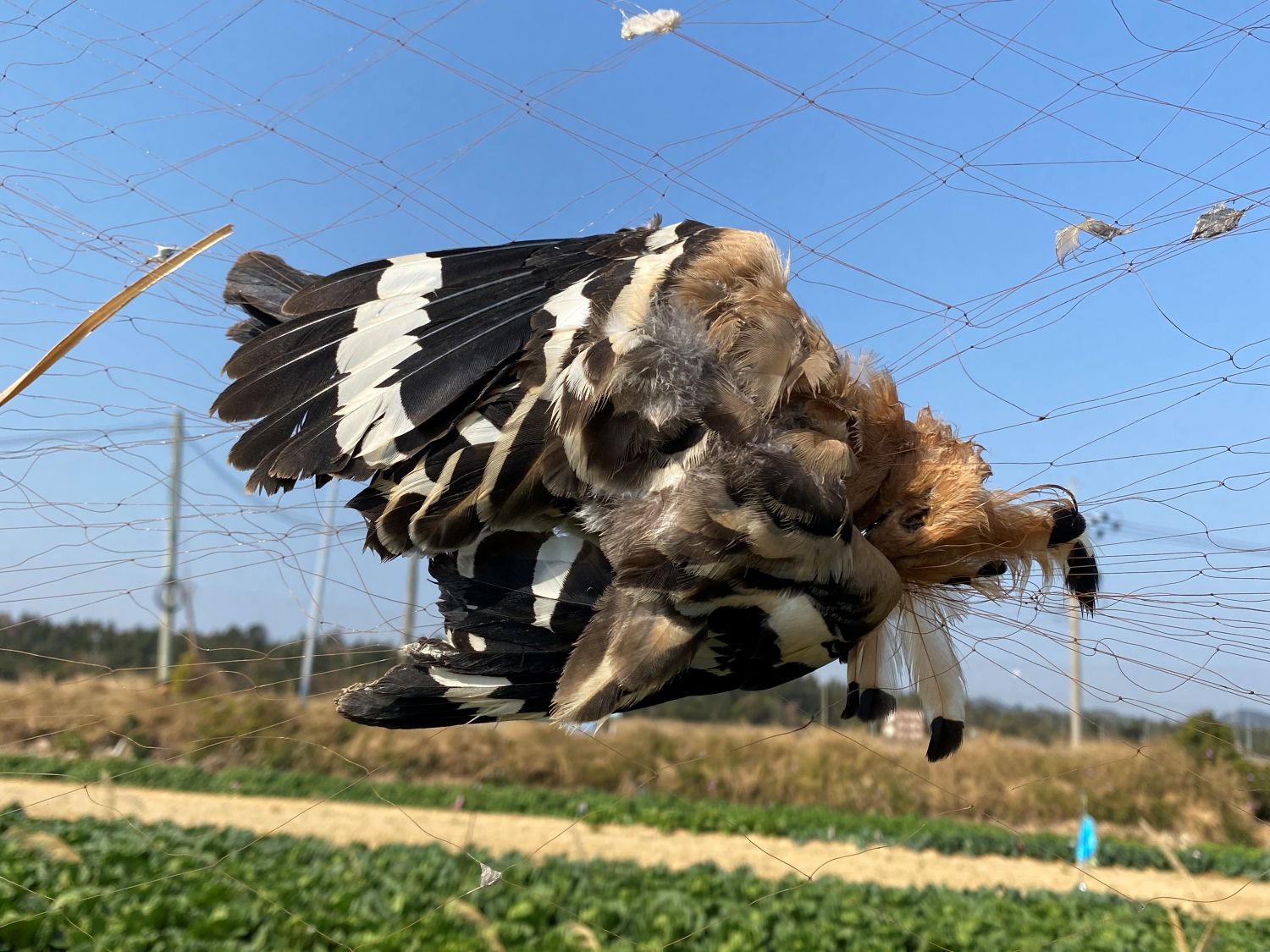 ▲戴勝受困於農田鳥網(。(圖/金門縣野生動物救援暨保育協會提供)