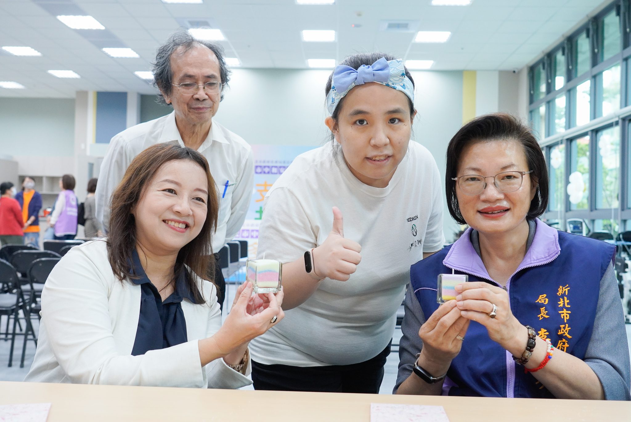 李美珍和貴賓利用倒砂在看板上寫出「支持多元、共融生活」等字,代表中和安邦日照中心的服務理念。隨後和學員一起手作砂蠟蠋,展現新北市推動「在地照顧、社區共融」的身障服務政策和精神。
