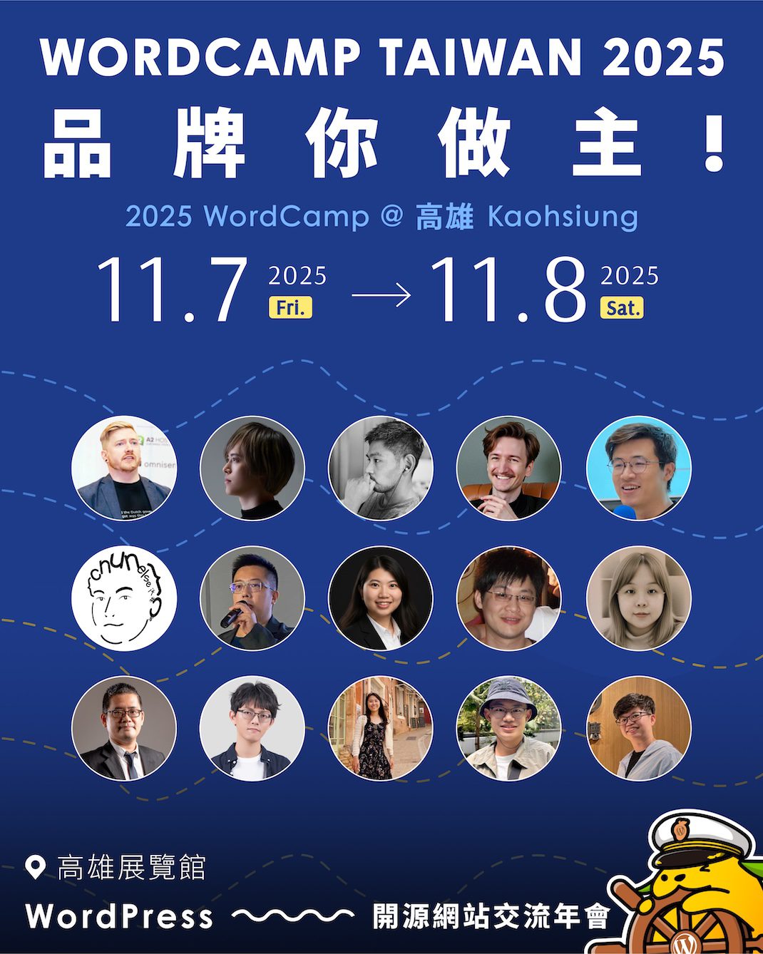 年度 WordPress 社群盛會 WordCamp Taiwan 2025 將於 2025 年 11 月 7 日至 8 日,首度移師南台灣,在高雄展覽館盛大登場。本次活動獲高雄市政府支持,結合開源文化與城市創新精神,為南台灣科技圈帶來前所未有的開放能量。