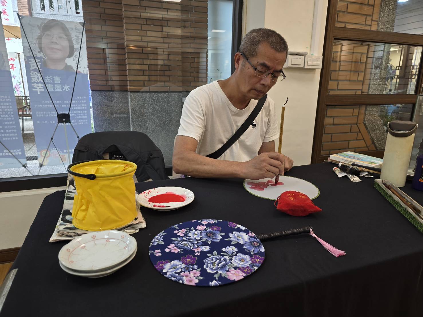 ▲扇子畫藝術家劉瑞光當場創作扇子畫。