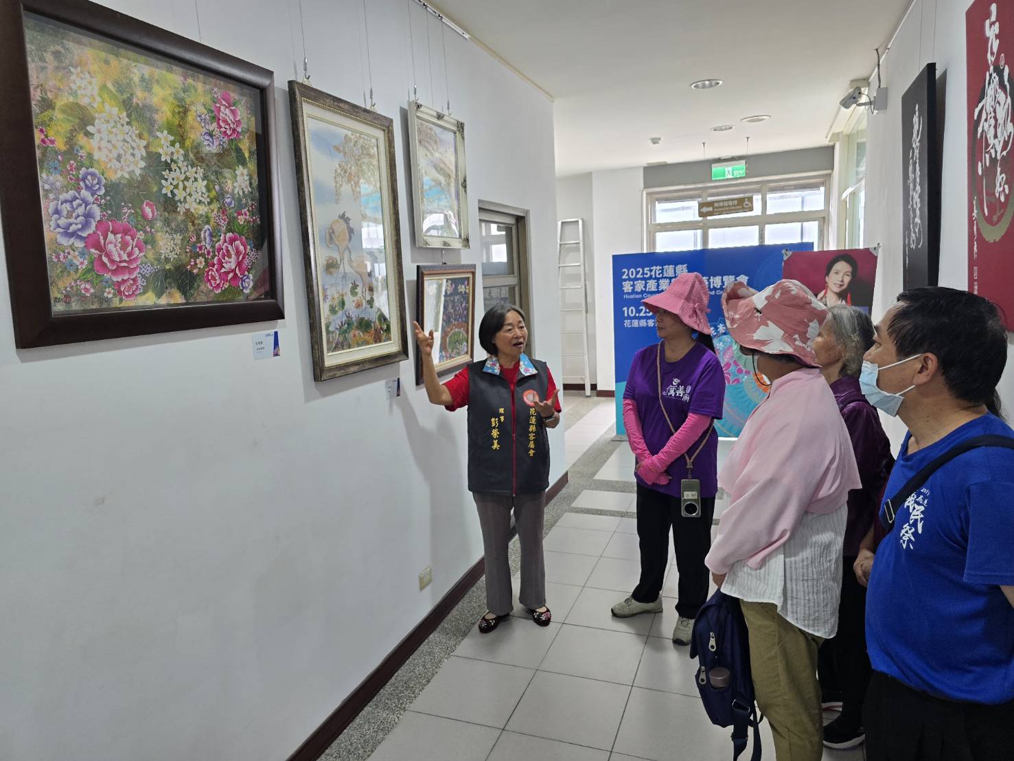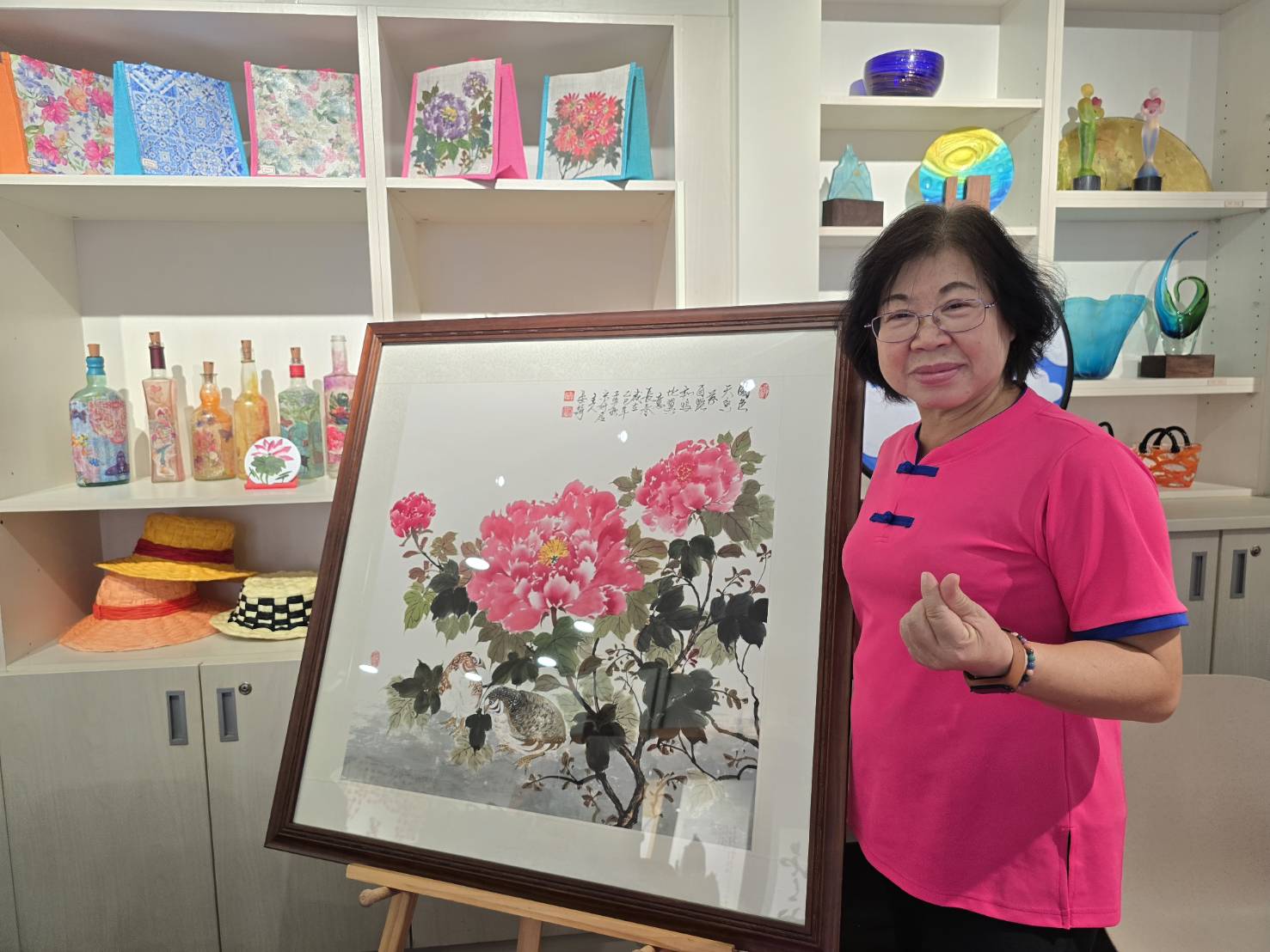 ▲花蓮在地藝術家彭榮美說明押花棉紙撕畫的特色。