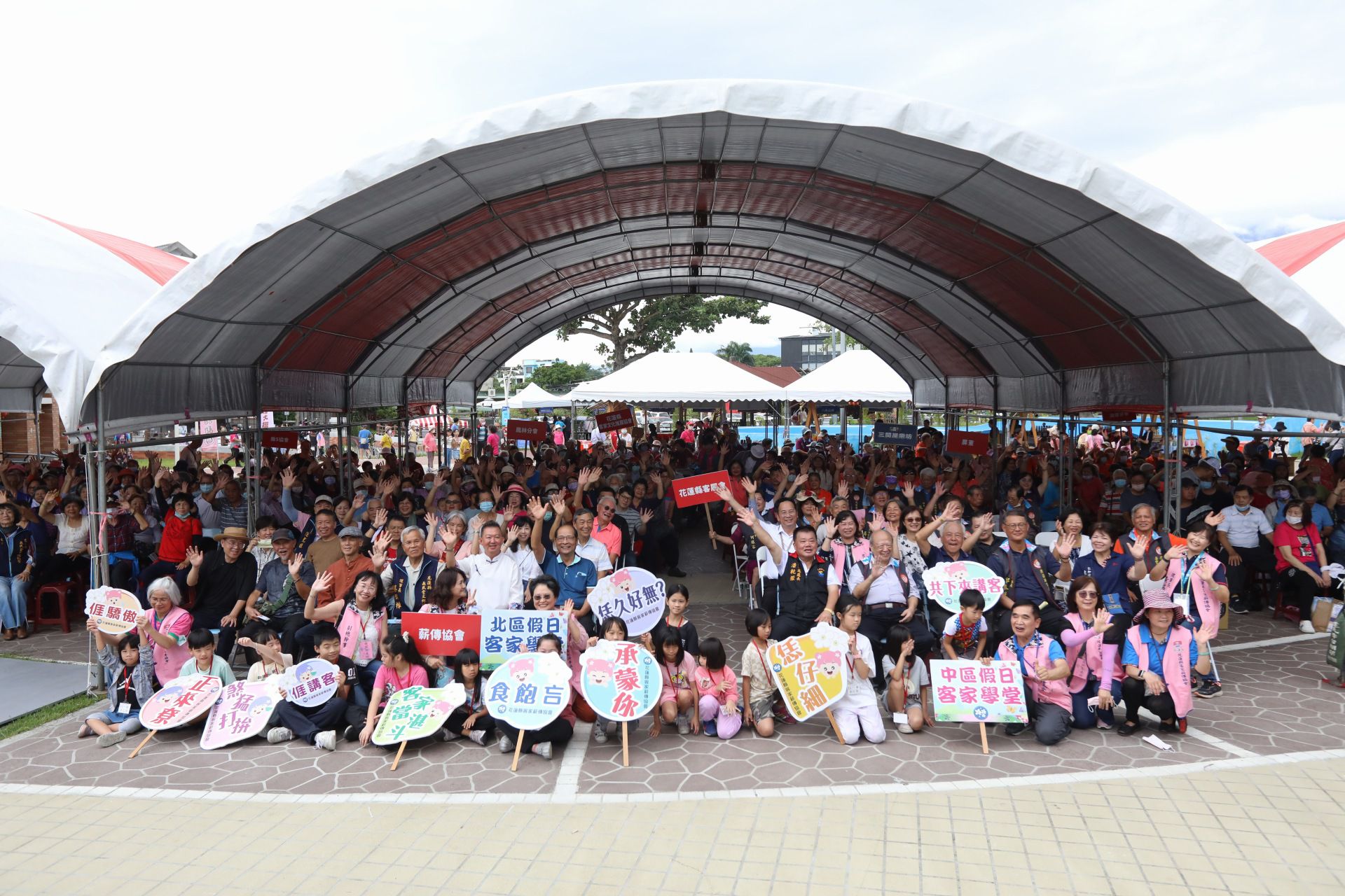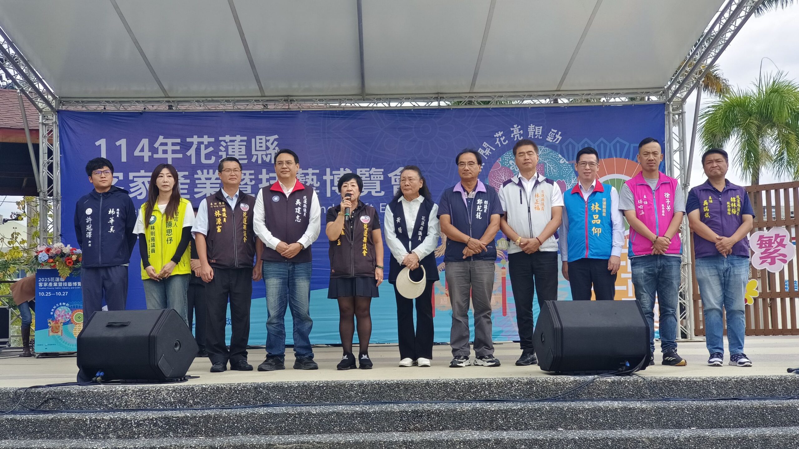 ▲花蓮縣副長徐雪玉(左五)等人紛紛為客家產業暨技藝博覽會跨刀相助。