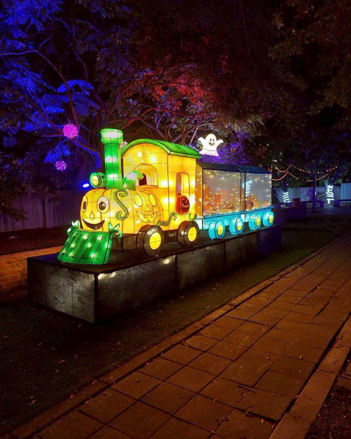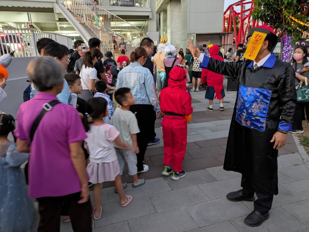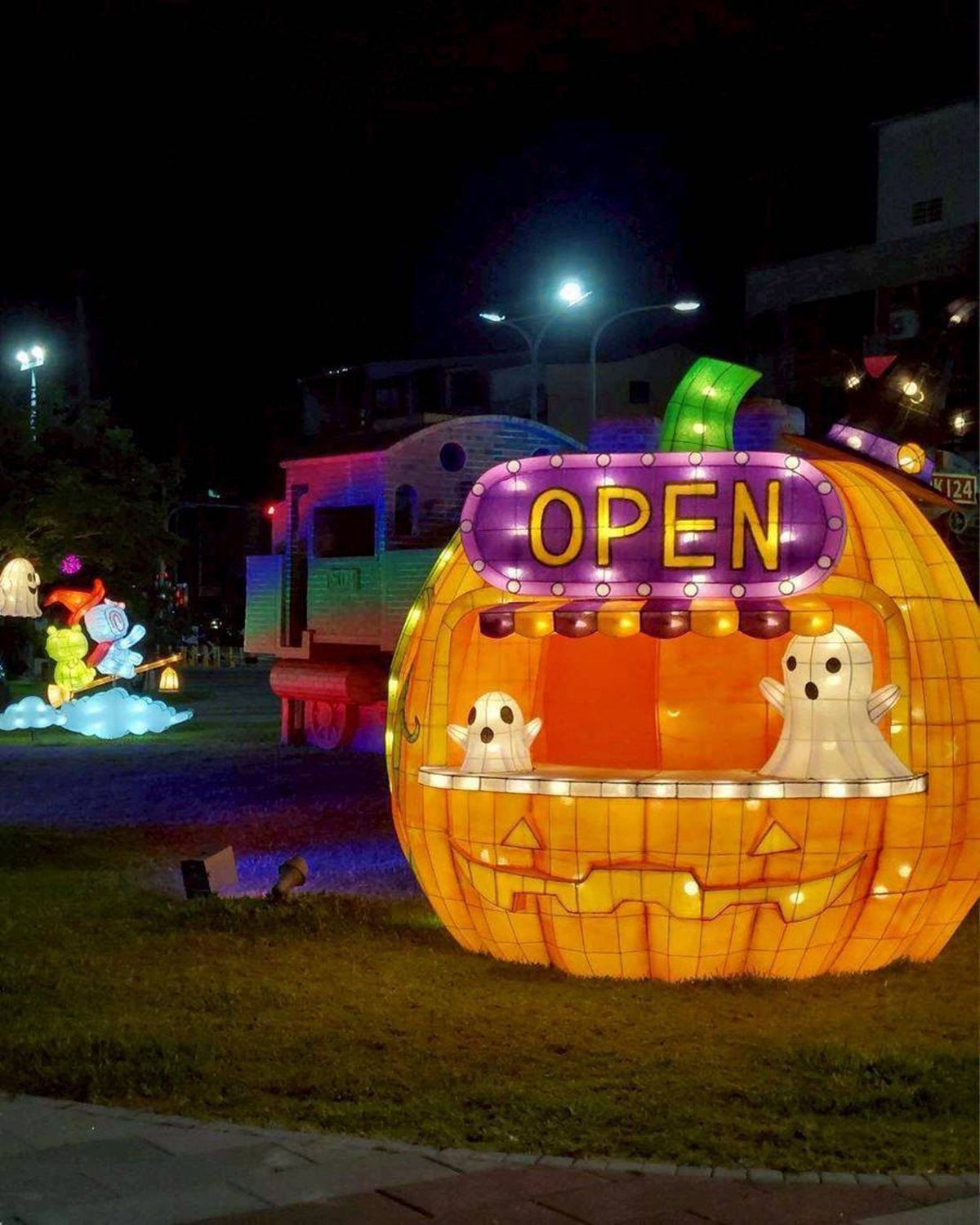 隨著夕陽西下,活動現場點亮一座3公尺高南瓜造型售票站燈景矗立眼前,彰化市公所表示,這次配合萬聖節從後站廣場起,沿著扇步道、戶羽機關車園區旁的小公園,再延伸至台鐵舊宿舍沿途佈置的地景燈飾,融入彰化鐵道元素,貫穿彰化後站廣場至臺鐵舊宿舍帶狀廊道區域,美不勝收。