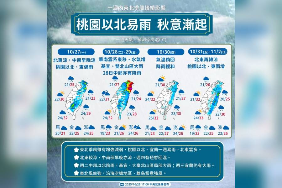 中央氣象署公布未來一周天氣,受東北季風接連影響,周二(28日)又有華南雲系東移,北東整周又會溼溼涼涼,預估低溫降至21度,出門記得隨身帶傘以防突來的降雨,中南部早晚則是比較涼,秋意漸起,早晚出門別忘了加件外套。