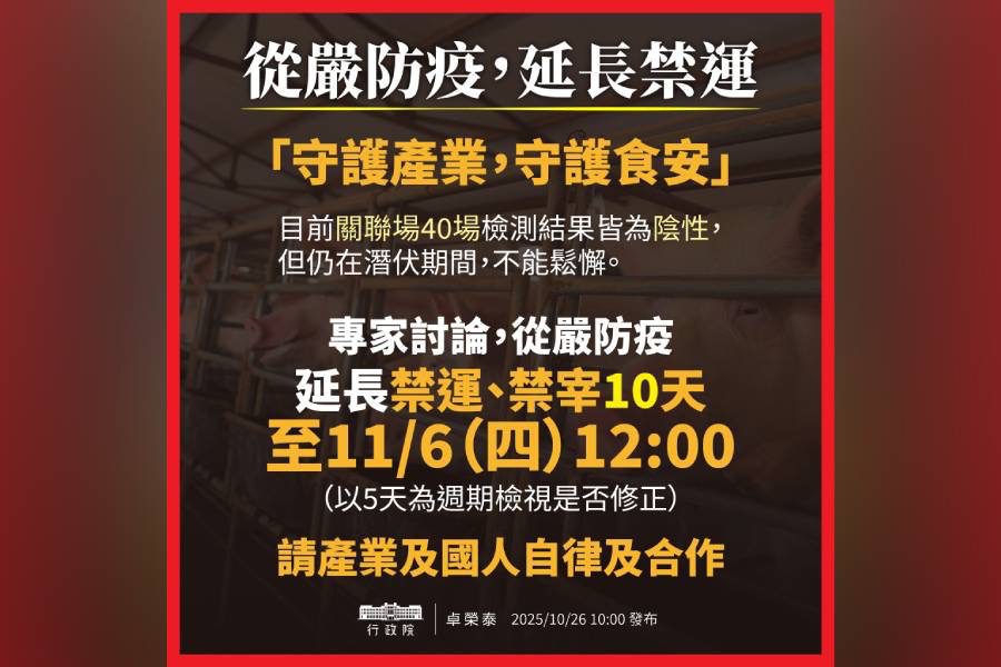 國內出現首例非洲豬瘟個案,雖然進一步檢測與案場關聯的40場,結果皆為陰性,但仍在潛伏期間,因此,行政院長卓榮泰宣布,禁運、禁宰豬隻的禁令再延長10天(至11/6 12:00),並以5天為週期檢視評估修正。