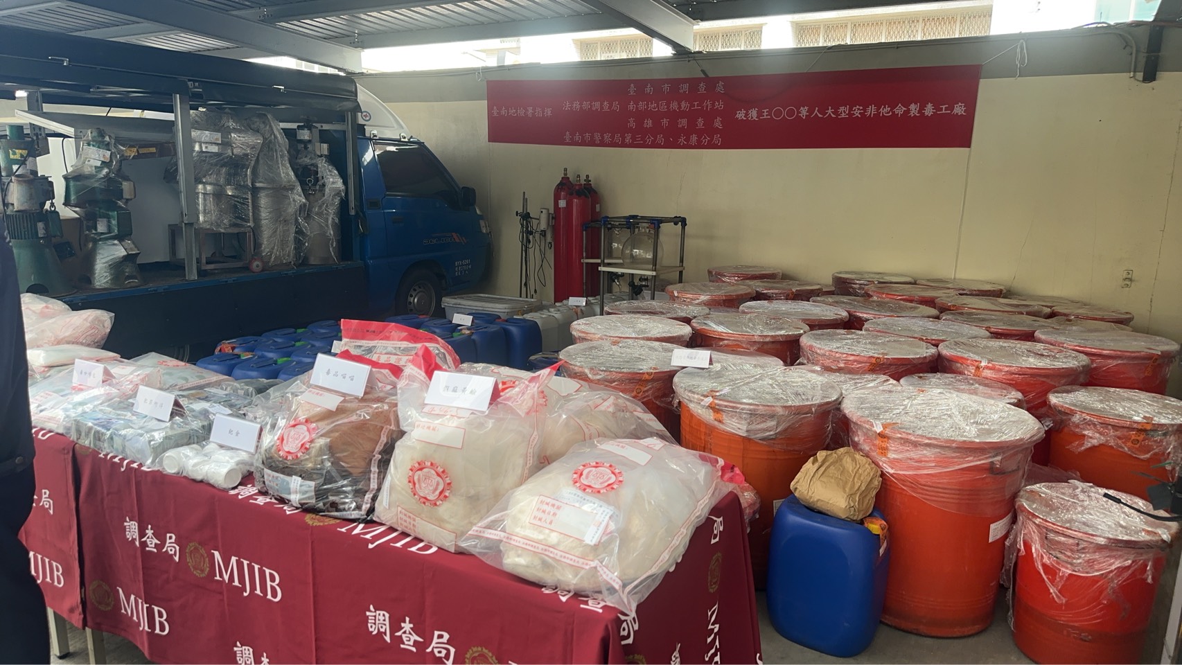 法務部調查局台南市調查處和南部地區機動工作站、高雄市調查處、台南市警第三分局及永康分局組成專案組,在台南地檢署檢察官陳琨智指揮下,於今年6月13日在台南市台江國家公園附近某處魚塭,破獲大型甲基安非他命等製毒工廠1座,查扣第二級毒品甲基安非他命及大麻約32.2公斤;第三級毒品愷他命約4.2公斤、4-甲基甲基卡西酮(俗稱:喵喵)約134公斤;第四級毒品先驅原料(假)麻黃鹼及1-甲基苯基-1-丙酮約50公斤,各級毒品合計逾220公斤,並扣得大批製毒設備、原料及販毒所得現金台幣456萬餘元,並拘提王姓主嫌及陳姓、力姓、孫姓等4人到案,經向台灣台南地方法院聲押獲准,全案依違反毒品危害防制條例移送台南地檢署偵辦,經檢察官偵結後於近日提起公訴。