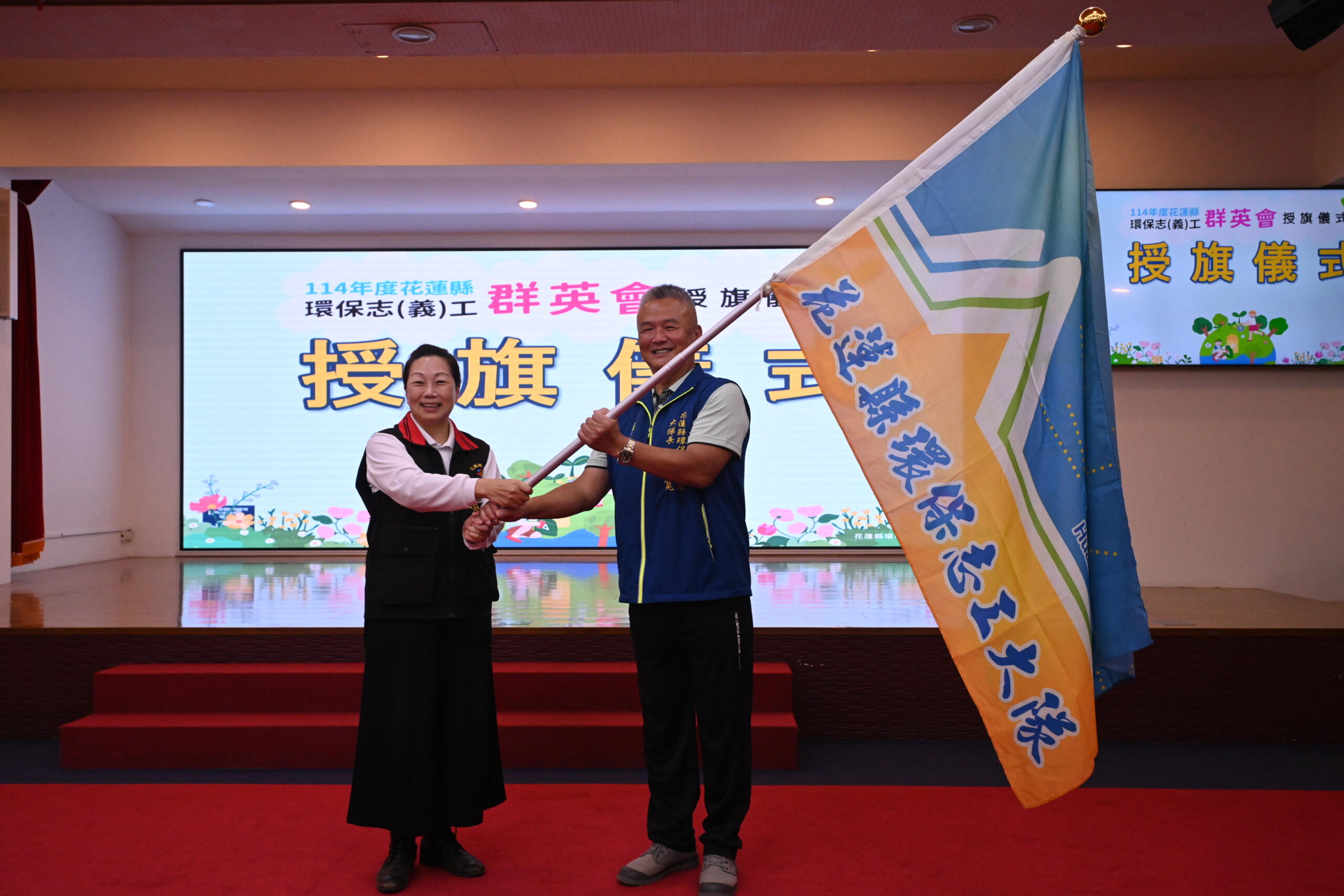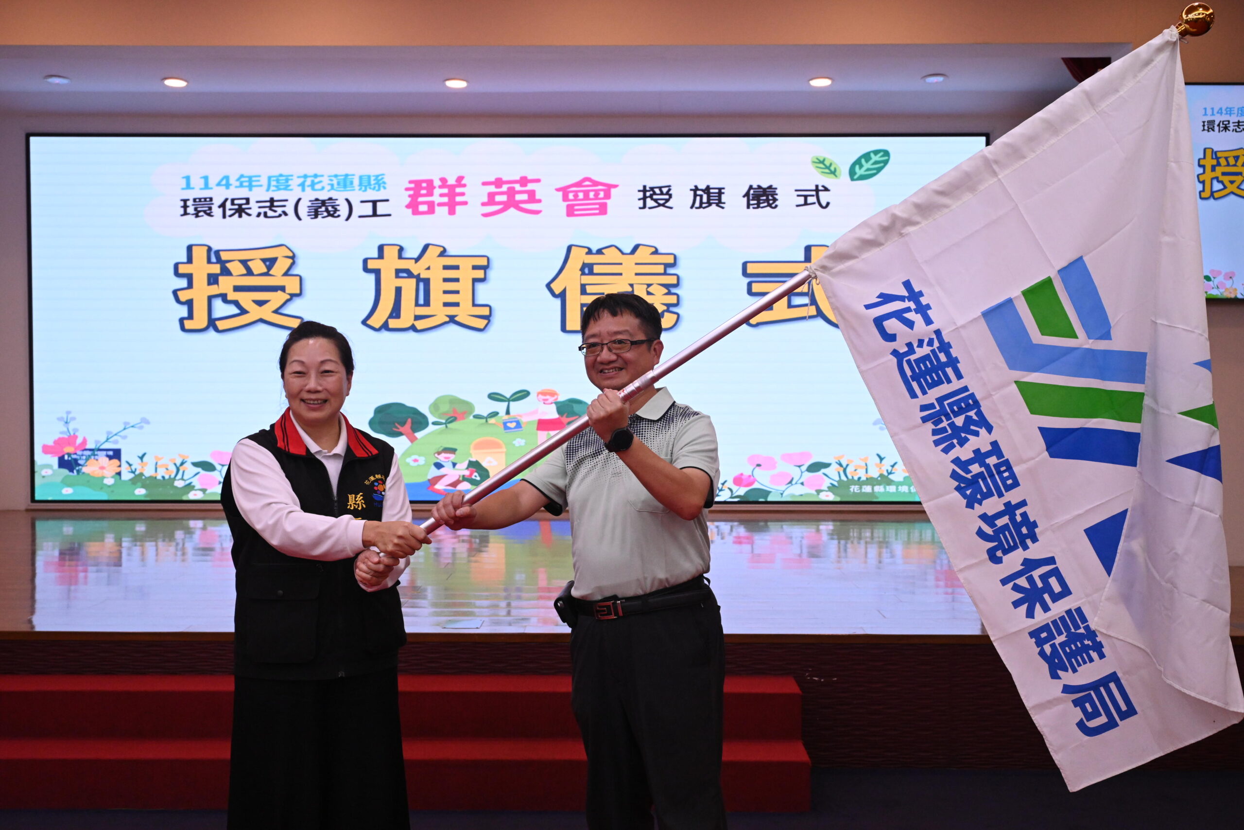 ▲花蓮縣長徐榛蔚(左)授旗給環保局祕書林蔡毓(右),企盼環保志工代表隊在全國賽事中,旗開得勝。
