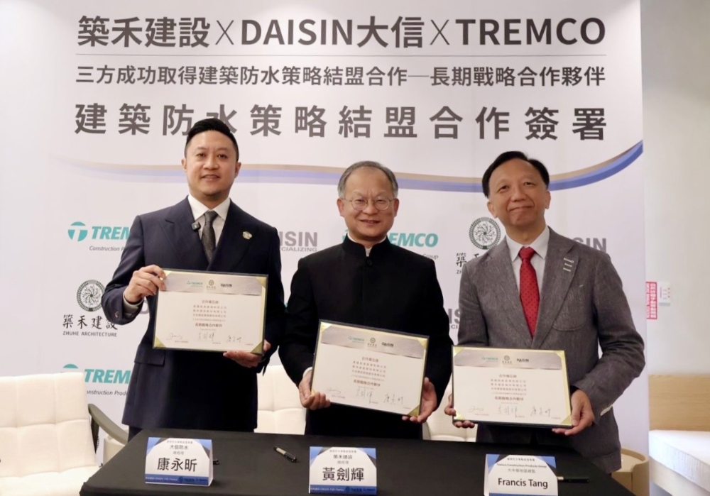 ▲ (左)大信集團執行總經理康永昕、(中)築禾建設總經理黃劍輝、(右)Tremco大中華地區總監Francis Tang,三方共同簽署建築防水策略結盟合作備忘錄。 (圖/大信集團提供)