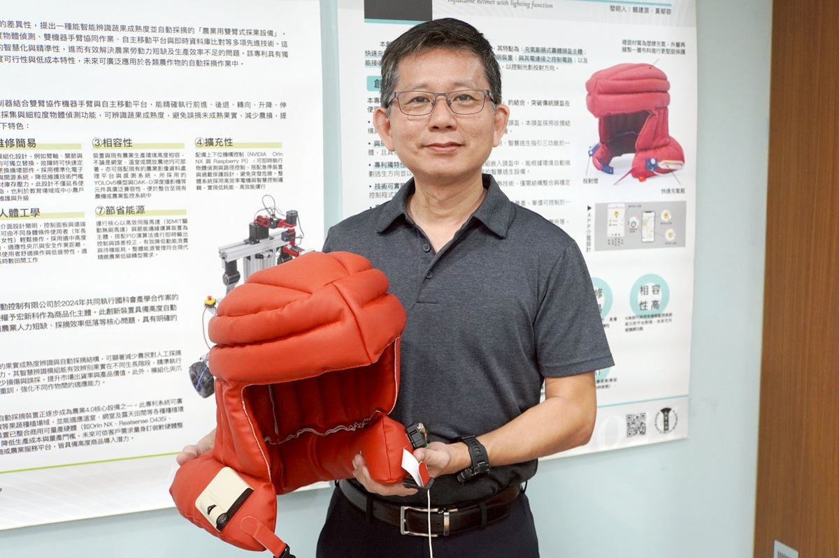 電機系黃登淵教授與宏新科自動控制有限公司合作開發的「農業用雙臂式採果設備」,同樣榮獲銀牌。本裝置結合雙目深度影像辨識與雙臂協作機器手臂,能快速、精準辨識果實成熟度,雙臂協力自動採摘,已完成技術移轉,可應用於番茄、草莓、小黃瓜、甜椒等果蔬場域,為農業4.0智慧自動化提供具體解方。
