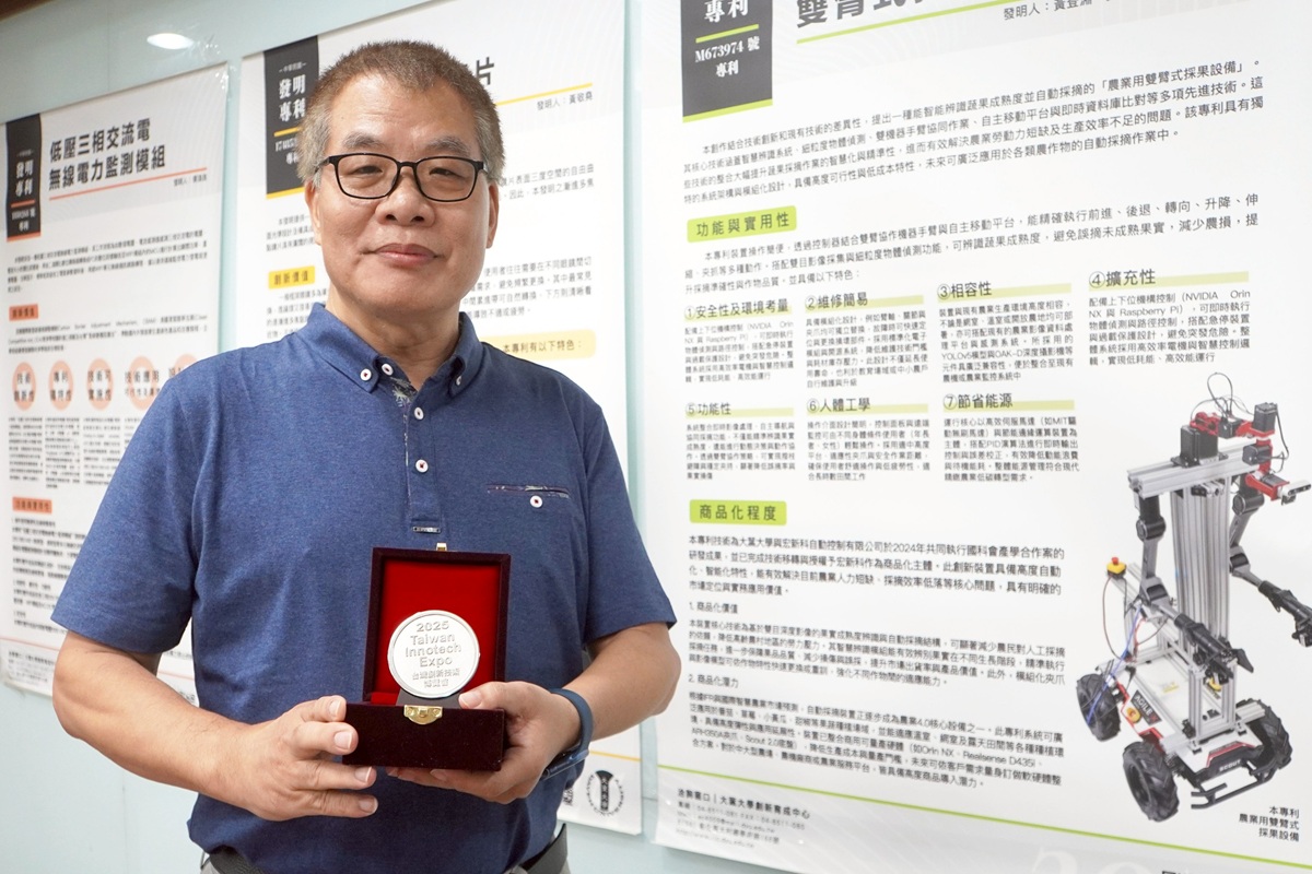▲大葉大學電機系黃登淵教授以農業用雙臂式採果設備獲得銀牌。(圖/大葉提供)