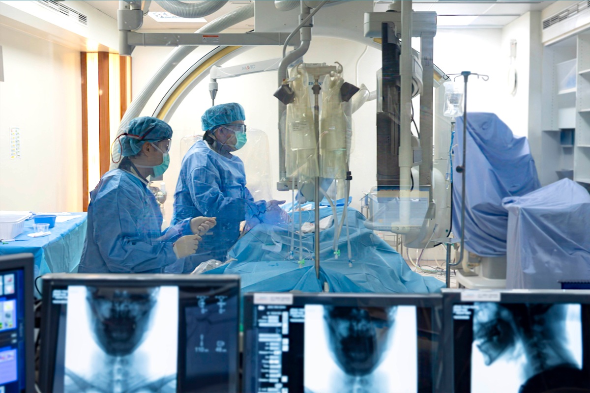 ▲彰基取栓團隊正在導管室中執行緊急手術,與時間賽跑搶救急性腦出血患者。(圖/彰基提供)